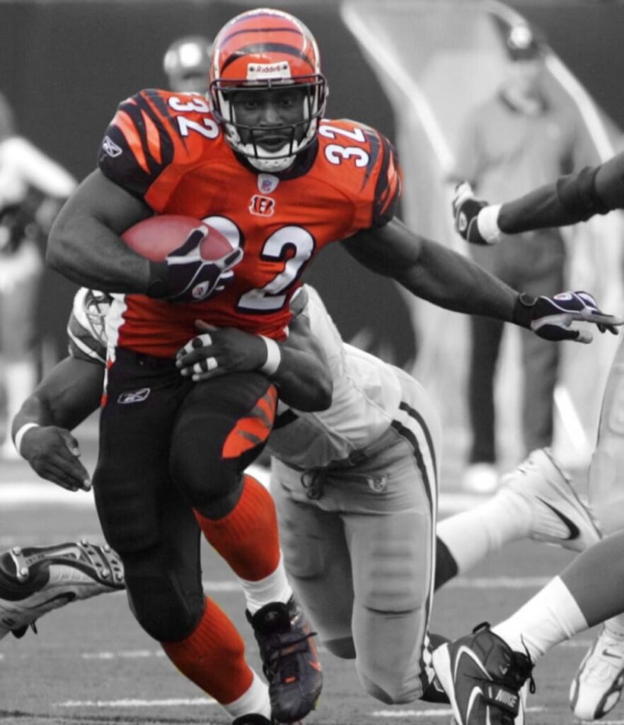 Rudi Johnson was drafted by the Cincinnati Bengals in the fourth round of the 2001 NFL Draft (pick 100). Initially a backup, he quickly rose to prominence as the team’s lead running back.